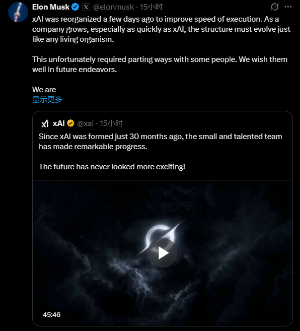 马斯克转发了这则帖文并补充道:“xAI几天前进行了重组,以提高执行速度。随着公司的发展,尤其像xAI这样快速增长的公司,其组织结构也必须像其他生物体一样不断演进。”
