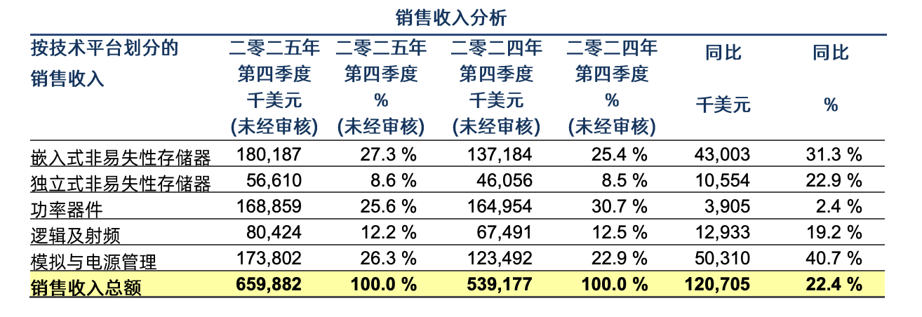 从收入结构来看,2025年第四季度,华虹公司嵌入式非易失性存储器销售收入为1.802亿美元,同比增长31.3%;独立式非易失性存储器销售收入实现5660万美元,同比增长22.9%;逻辑及射频产品销售收入为8040万美元,同比增长19.2%;模拟与电源管理销售同比增长40.7%,实现1.738亿美元。