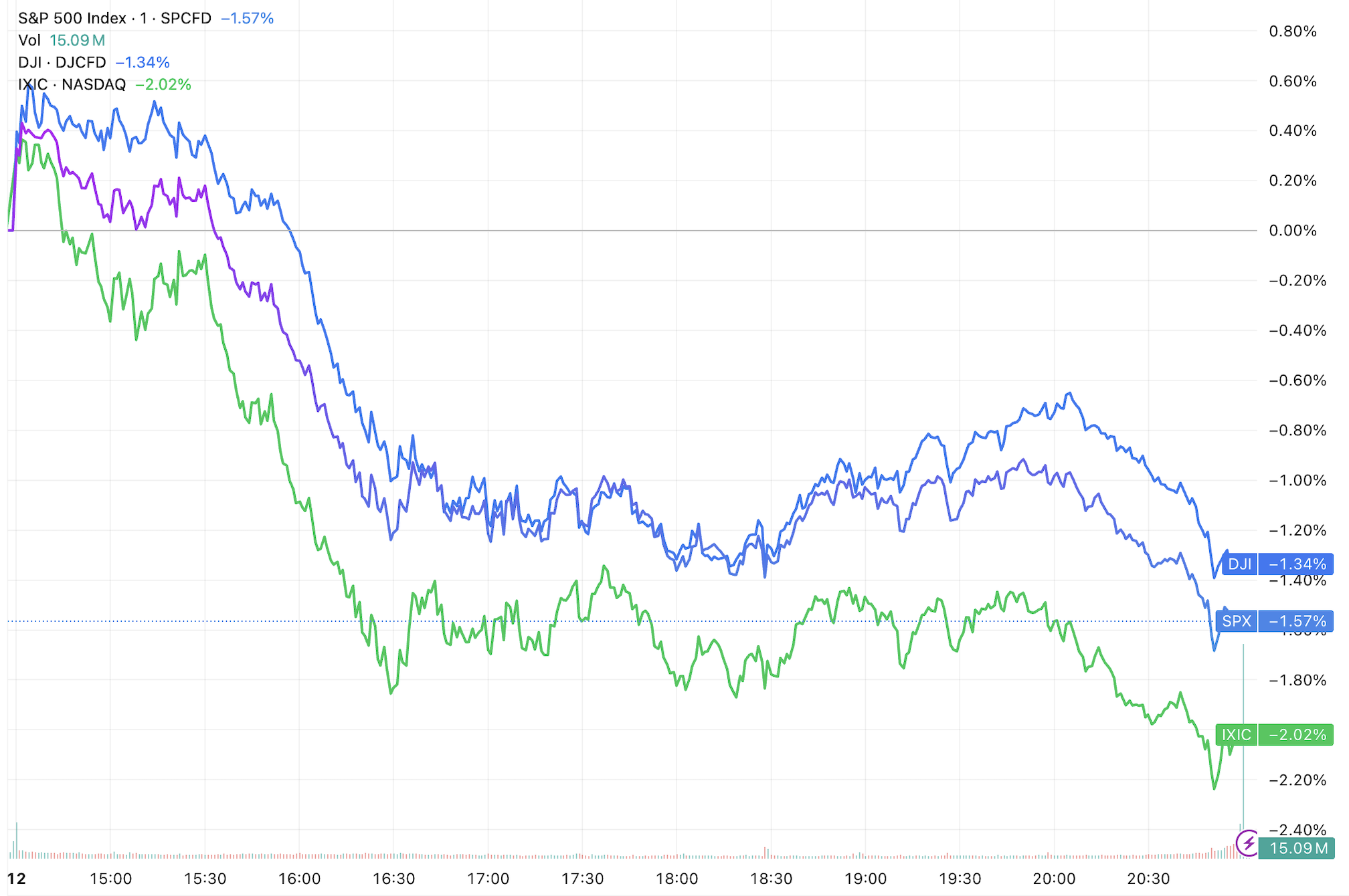 截至收盘,道琼斯指数跌1.34%,报49,451.98点;标普500指数跌1.57%,报6,832.76点;纳斯达克指数跌2.03%,报22,597.15点。