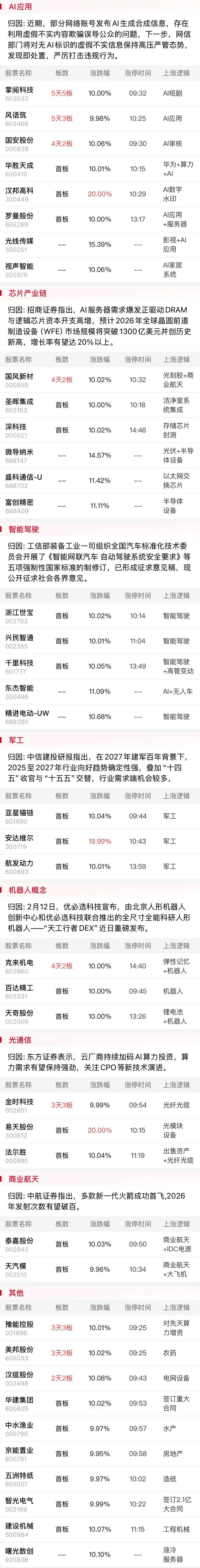 火山引擎定于2月14日发布豆包大模型2.0、Seedance 2.0、Seedream 5.0 Preview,近期Seedance 2.0的火爆,引发网信部门督促网站平台深入排查整治AI生成合成信息发布时,存在利用虚假不实内容欺骗误导公众的问题。AI审核概念早盘逆势活跃,汉邦高科、国安股份涨停,视声智能一度涨超20%。此外受益版权价值重估的影视、文化传媒板块回暖,掌阅科技弱转强晋级5连板,而随着影视龙头股光线传媒强势反包午后一度逼近涨停,横店影视、博纳影业两只板块人气股快速打开跌停后展开强修复,与部分资金博弈春节档票房的传统资金记忆密切相关。不过需要注意的是,与去年电影《哪吒2》的超预期表现不同的是,在Seedance2.0火爆对影视板块进一步催热后,反而需要警惕长假期间票房数据不及预期对该板块节后表现的冲击。