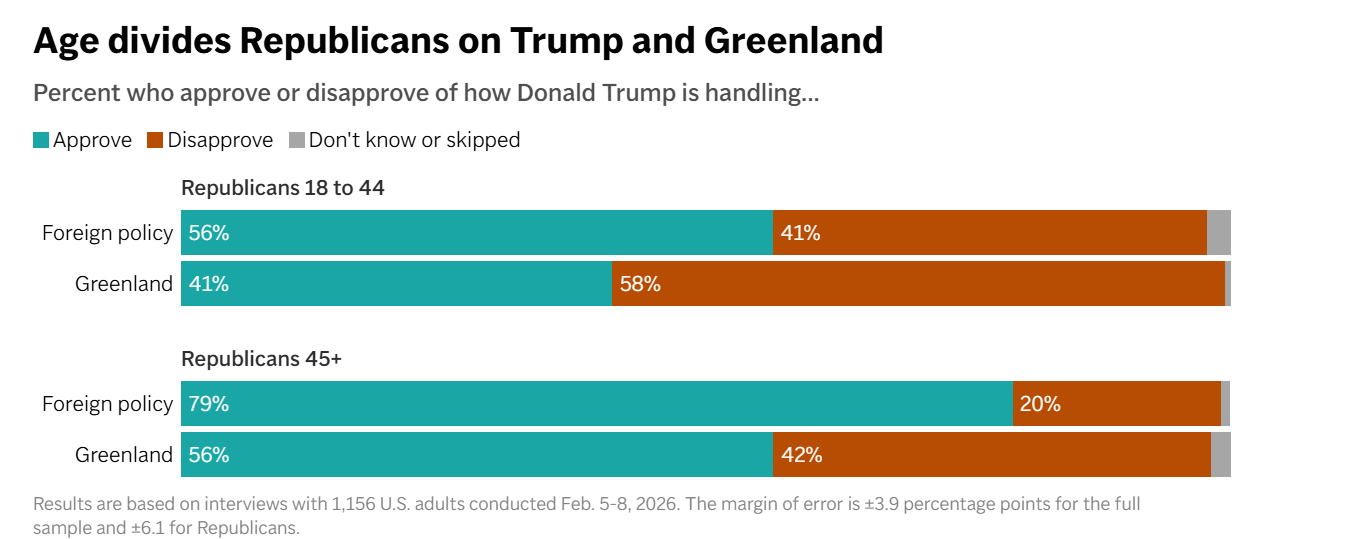 调查还显示,年轻的共和党人尤其会对特朗普处理格陵兰问题的方式表示不满。