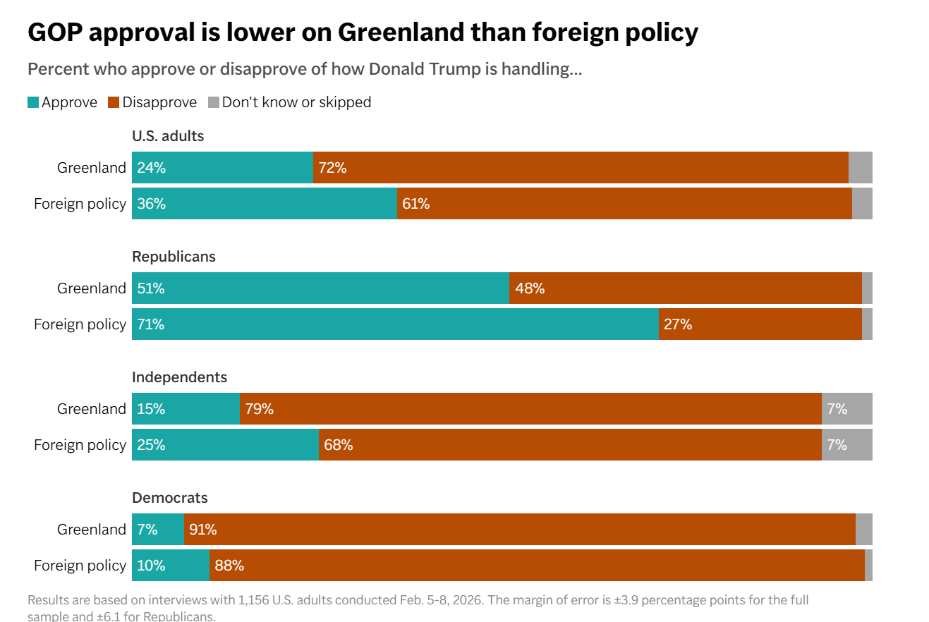 这项民调于2月5日至8日进行,当时特朗普已决定取消旨在迫使欧洲国家支持美国控制格陵兰岛的关税,但他此前数周来推动美国干预该岛的努力仍在继续。