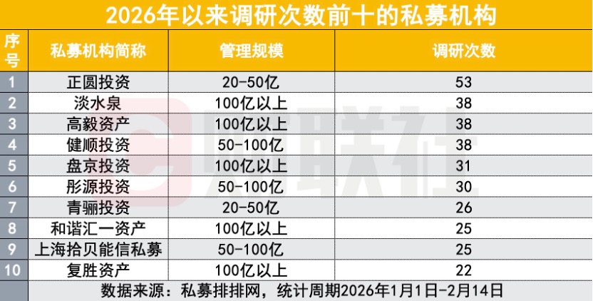 财联社2月14日讯(记者 闫军)2026年春节临近,私募机构的调研动向成为市场关注的焦点。作为洞察机构资金布局的重要窗口,私募调研的频率和方向折射节后布局市场热点与投资逻辑。