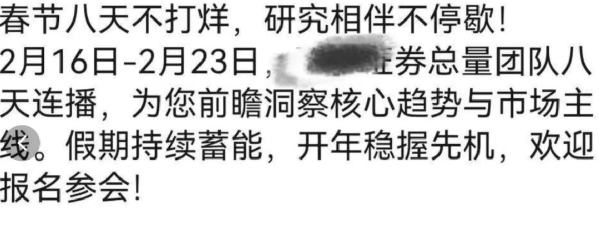 一份网传截图显示“春节八天不打烊,研究相伴不停歇!2月16日-2月23日,xx证券总量团队八天连播”,于近日广泛传播,据称该截图中券商是西部证券。