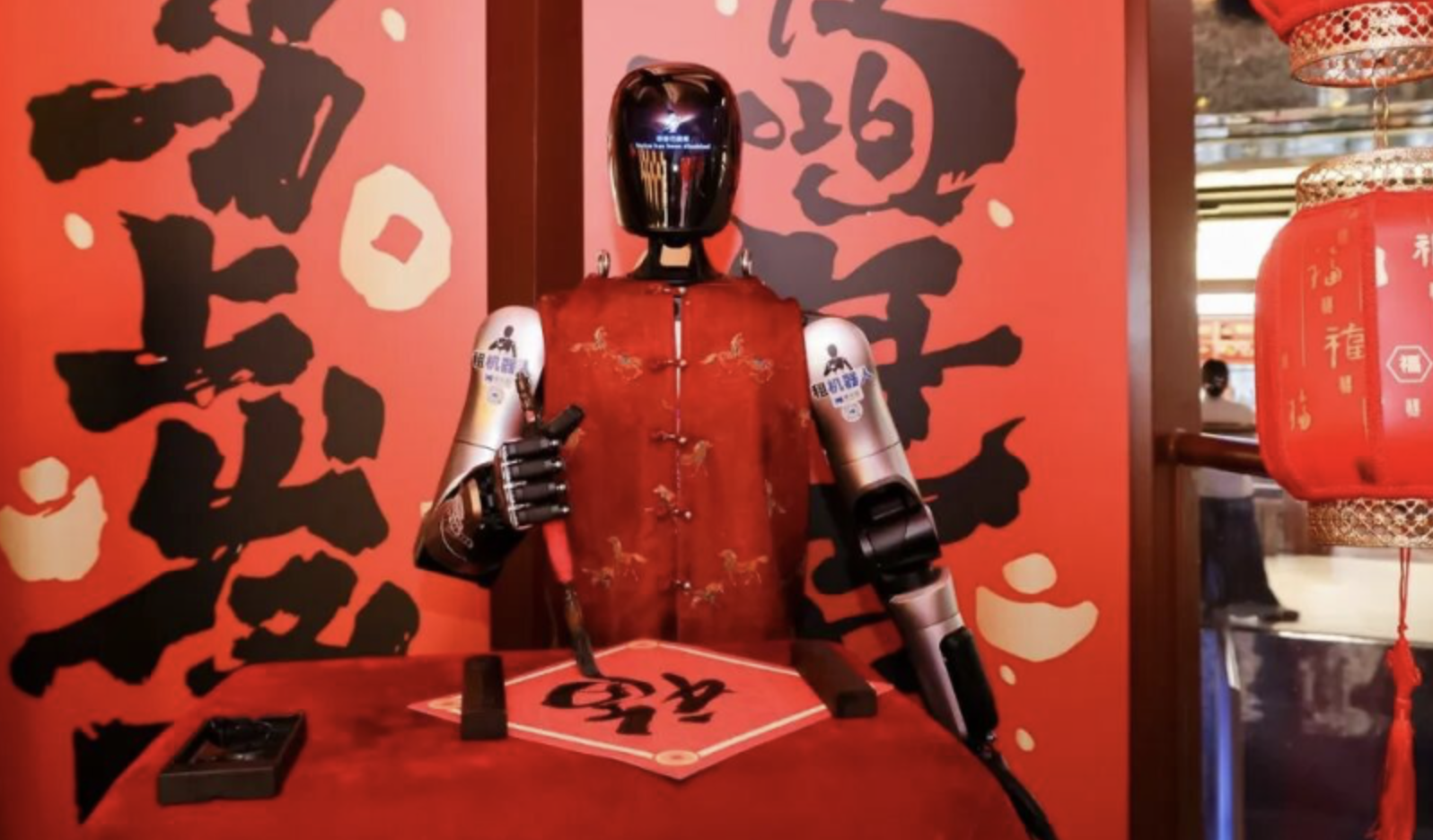 机器人“书法家”挥毫泼墨,亲手书写新春“福”字,送给来往宾客。