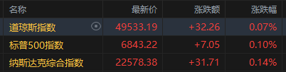 截至收盘,道琼斯指数涨0.07%,报49533.19点;标普500指数涨0.1%,报6843.22点;纳斯达克综合指数涨0.14%,报22578.38点。