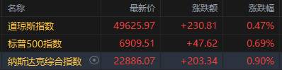 截至收盘,道琼斯指数涨0.47%,报49625.97点;标普500指数涨0.69%,报6909.51点;纳斯达克综合指数涨0.9%,报22886.07点。