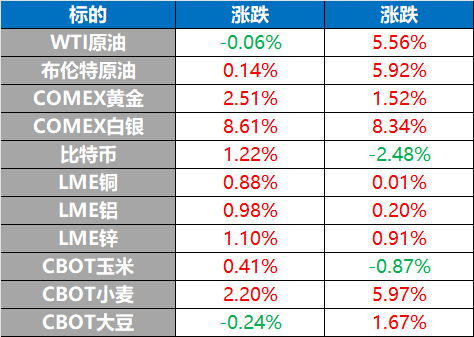 现货黄金涨2.15%,报5104.90美元/盎司,本周累计上涨1.27%;COMEX黄金期货涨2.51%,报5122.80美元/盎司,本周累涨1.52%。现货白银涨7.81%,报84.6396美元/盎司,本周累涨9.31%;COMEX白银期货涨8.61%,报84.970美元/盎司,本周累涨8.34%。