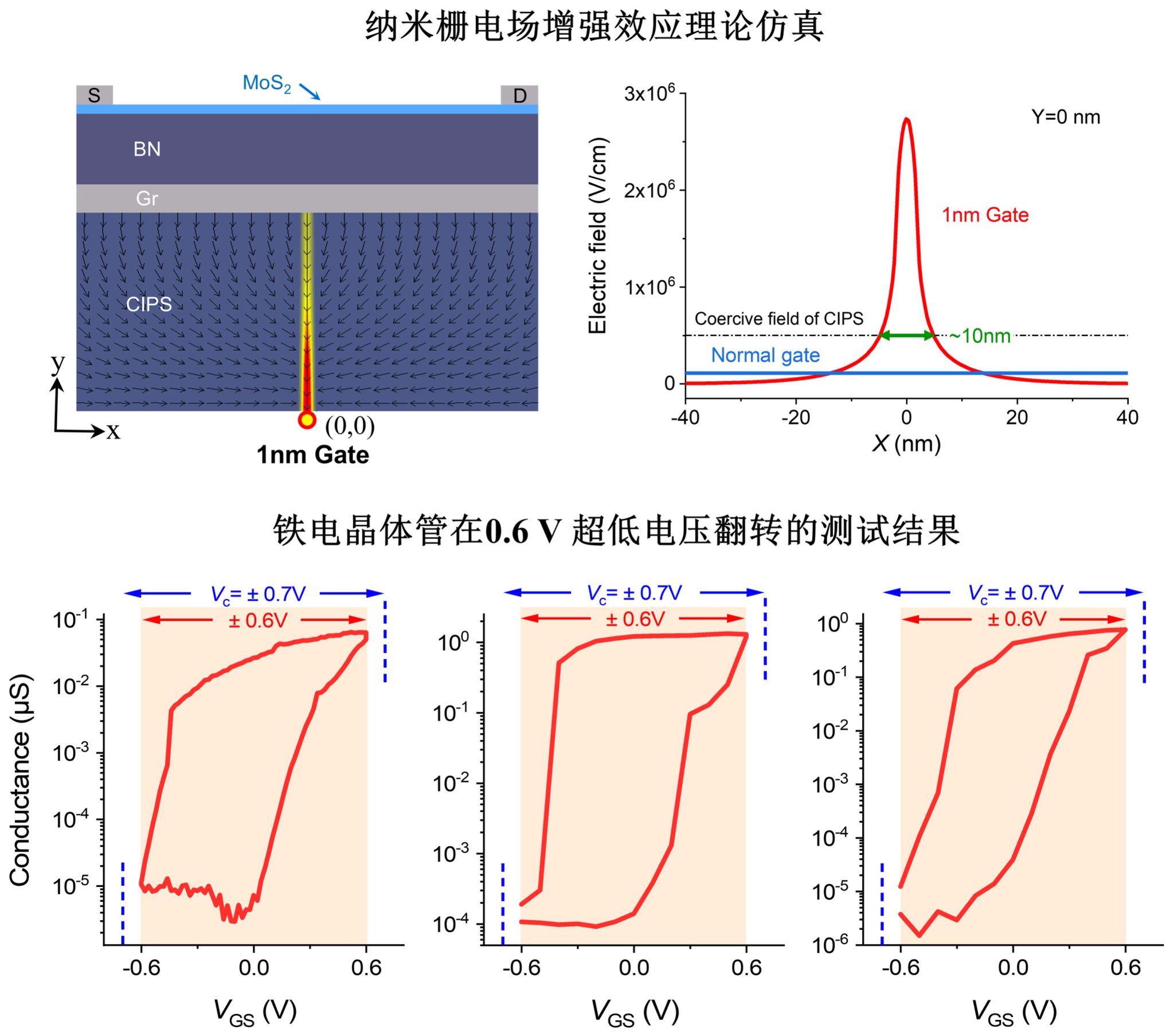 在本工作中,邱晨光-彭练矛团队首次提出“纳米栅铁电晶体管结构”和“纳米栅极电场增强机理”。通过优化器件结构,巧妙地将栅电极尺寸缩小到纳米极限尺度。利用纳米栅的尖端电场汇聚效应,在铁电层中构建了高度局域化的强电场汇聚区,有效地放大了局部电场强度,大幅降低铁电极化翻转电压,超越了常规平板铁电体的矫顽电压极限,打破了“低电压与高矫顽电场不可兼得”的固有认知,实现了0.6V超低工作电压,将铁电存储电压降低到和逻辑电压相当水平。研制的铁电晶体管能耗水平低至0.45 fJ/μm,领先国际已有报道一个数量级,存储速度接近1纳秒。该研究在国际上首次发现铁电晶体管具有反常的尺寸微缩优势,即物理栅长微缩到极限1纳米时显著汇聚并增强了电场,极小栅极尺寸有效改善了铁电存储特性,充分表明铁电存储器在构建未来亚纳米节点芯片具有显著优势。