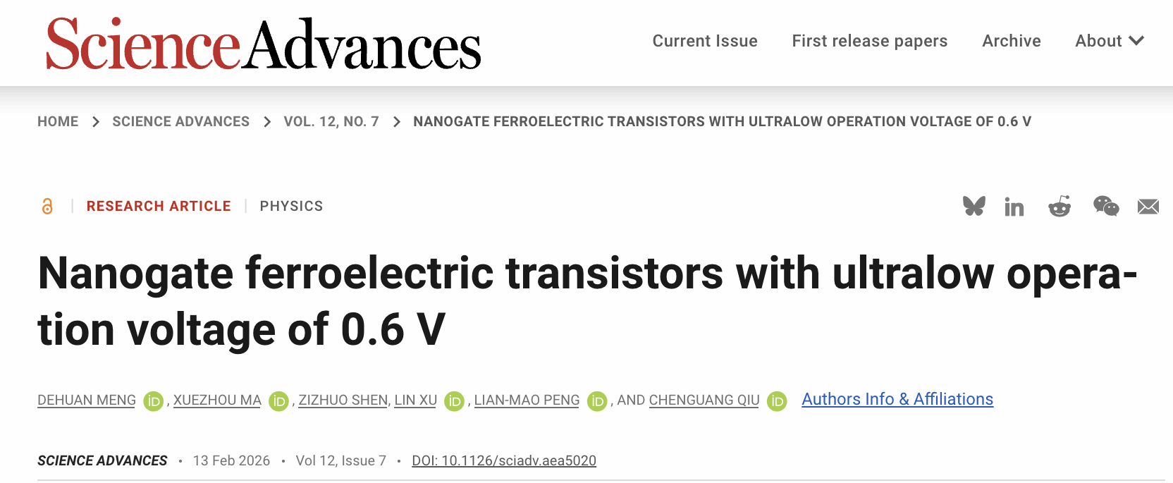 电子学院邱晨光-彭练矛团队研制出国际上最低功耗铁电晶体管