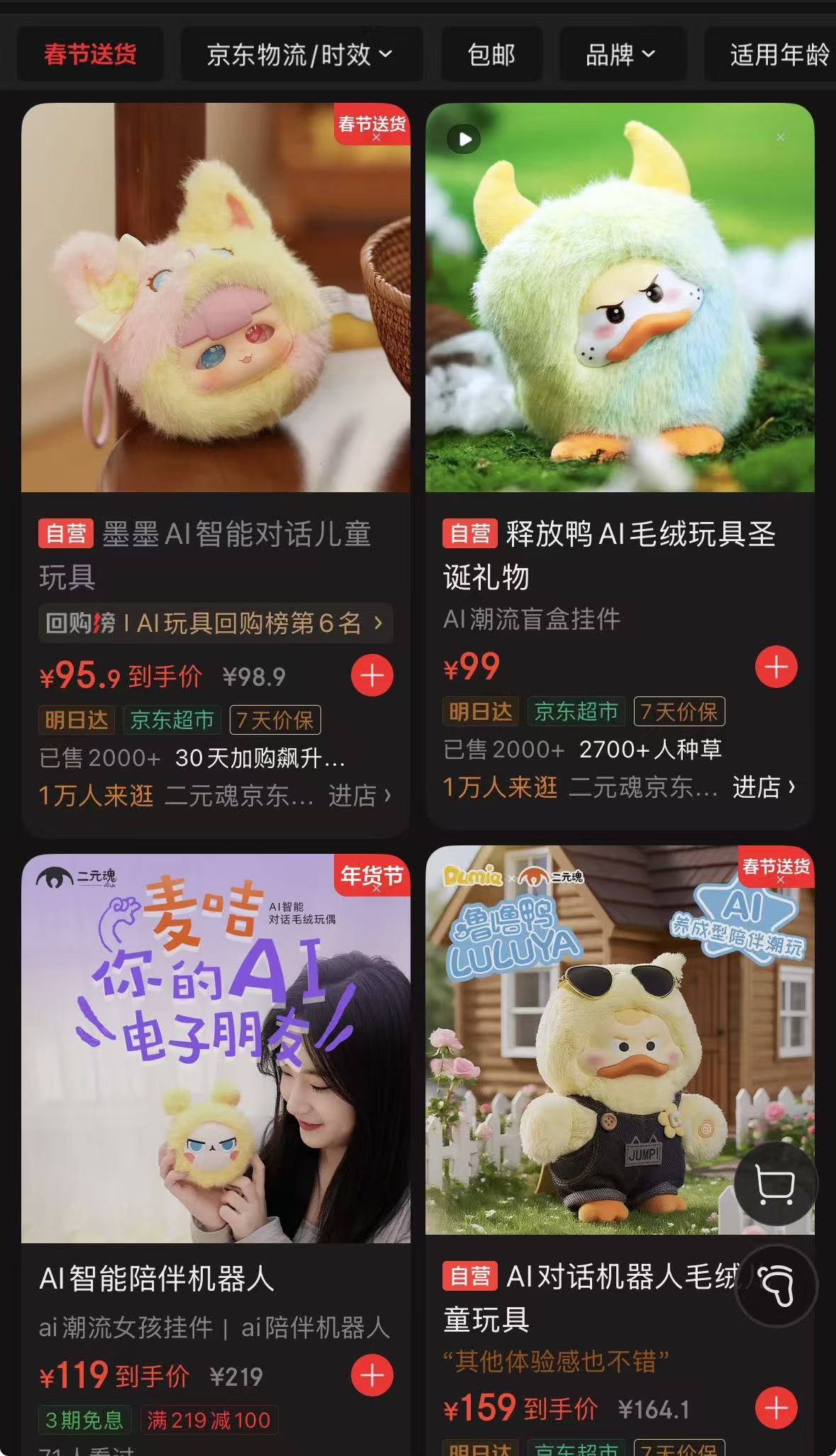 在京东APP平台,墨墨智能对话儿童玩具名列AI玩具回购榜第六,30天内加购飙升,首页还标有“春节送货”字样。