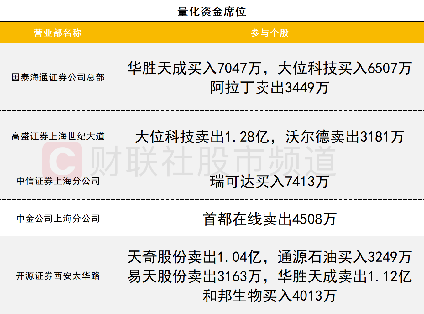 量化资金活跃度明显降低,大位科技遭两家量化激烈博弈,获国泰海通证券公司总部买入6507万,同时遭高盛证券上海世纪大道营业部卖出1.28亿。
