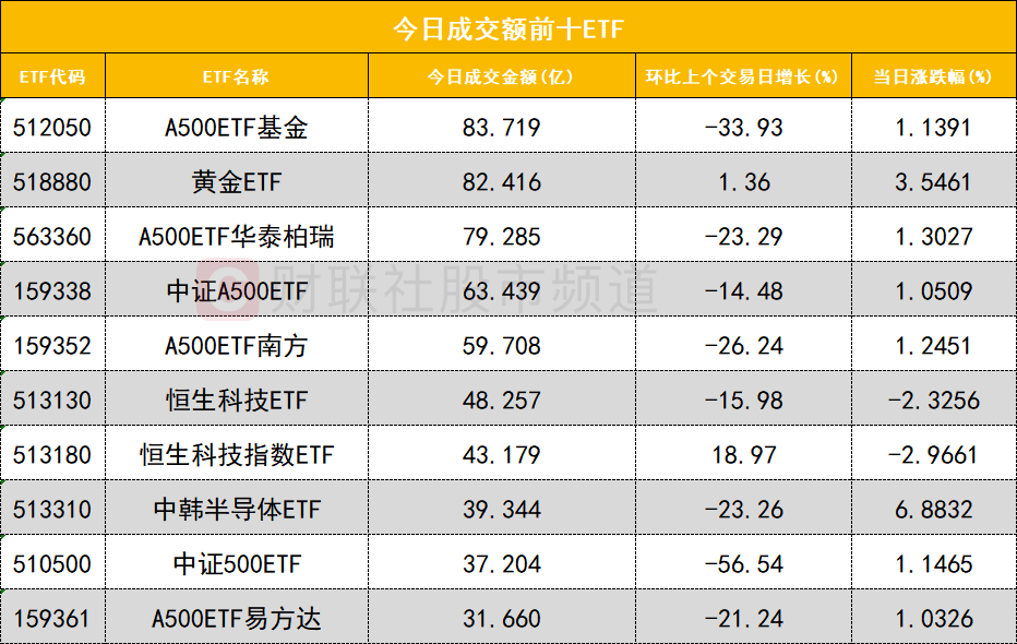 从成交额前十的ETF来看,A500ETF基金(512050)成交额位居首位,黄金ETF(518880)成交额位居次席。