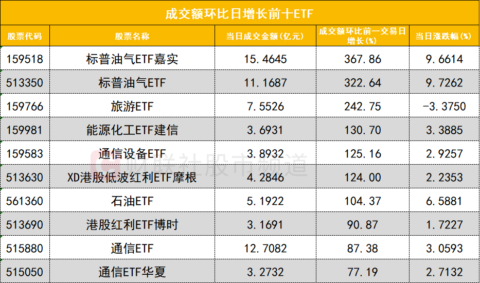 从成交额环比增长前十的ETF来看,标普油气ETF嘉实(159518)成交额环比增长367%位居首位;标普油气ETF(513350)成交额环比增长322%位居次席。
