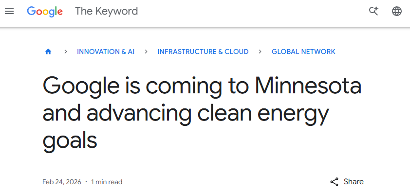 此外,谷歌还将按照特别电价机制为可再生能源支付溢价费用,以在保护普通消费者免受基础设施成本冲击的同时,加快明尼苏达州清洁能源部署。
