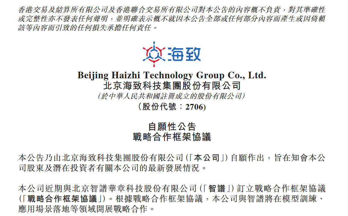 2月24日晚间,海致科技集团在港交所公告称,公司近期与北京智谱华章科技股份有限公司(以下简称“智谱”)签署新一轮战略合作框架协议。