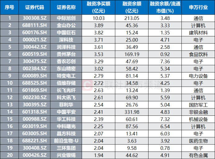 具体个股方面,累计共有19股节后首日获融资客超1亿元加仓。其中,中际旭创唯一融资净买额在10亿元以上,金山办公、中国巨石、深科技、润泽科技、贵州茅台、香农芯创、东山精密、特变电工、佰维存储等股融资净买额也居前,而光线传媒、宁德时代、英维克、北方稀土、恒力石化、长江电力、中国石油、大位科技等股融资净卖额居前。