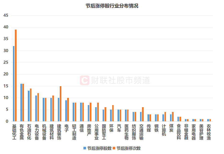 按行业板块统计,节后A股市场的涨停股呈现明显的聚集特征。从涨停股数来看,基础化工板块以32股的涨停数量领跑,占全市场涨停股总量的17%,有色金属、石油石化紧随其后,其三大周期板块合计贡献了三分之一的涨停标的。从涨停次数看,基础化工板块同样位居榜首,其涨停次数占比达18.4%,有色金属、石油石化、电力设备板块该比例也居前。