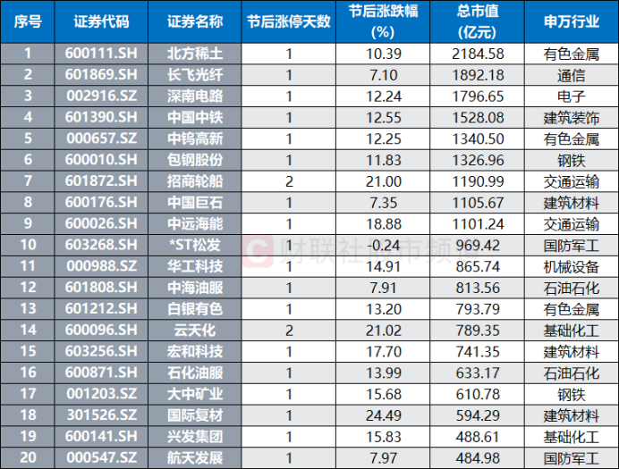 具体个股来看,节后涨停的个股中不乏多只千亿股在列,分别为北方稀土、长飞光纤、深南电路、中国中铁、中钨高新、包钢股份、招商轮船、中国巨石、中远海能。其中,港口海运股招商轮船节后录得连板行情,值得注意的是,其今日股价收于14.75元,创历史新高,同时全天成交额30.87亿元,为2015年8月以来近十年高点。
