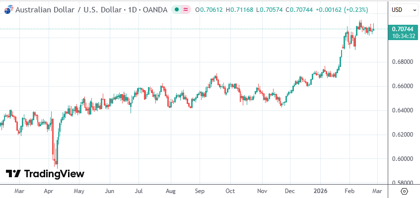 年初至今,澳元兑美元已累涨超6%,升至近三年来高位。本月早些时候,澳大利亚储备银行宣布将基准利率上调25个基点至3.85%,这也是该行两年多来首次加息。