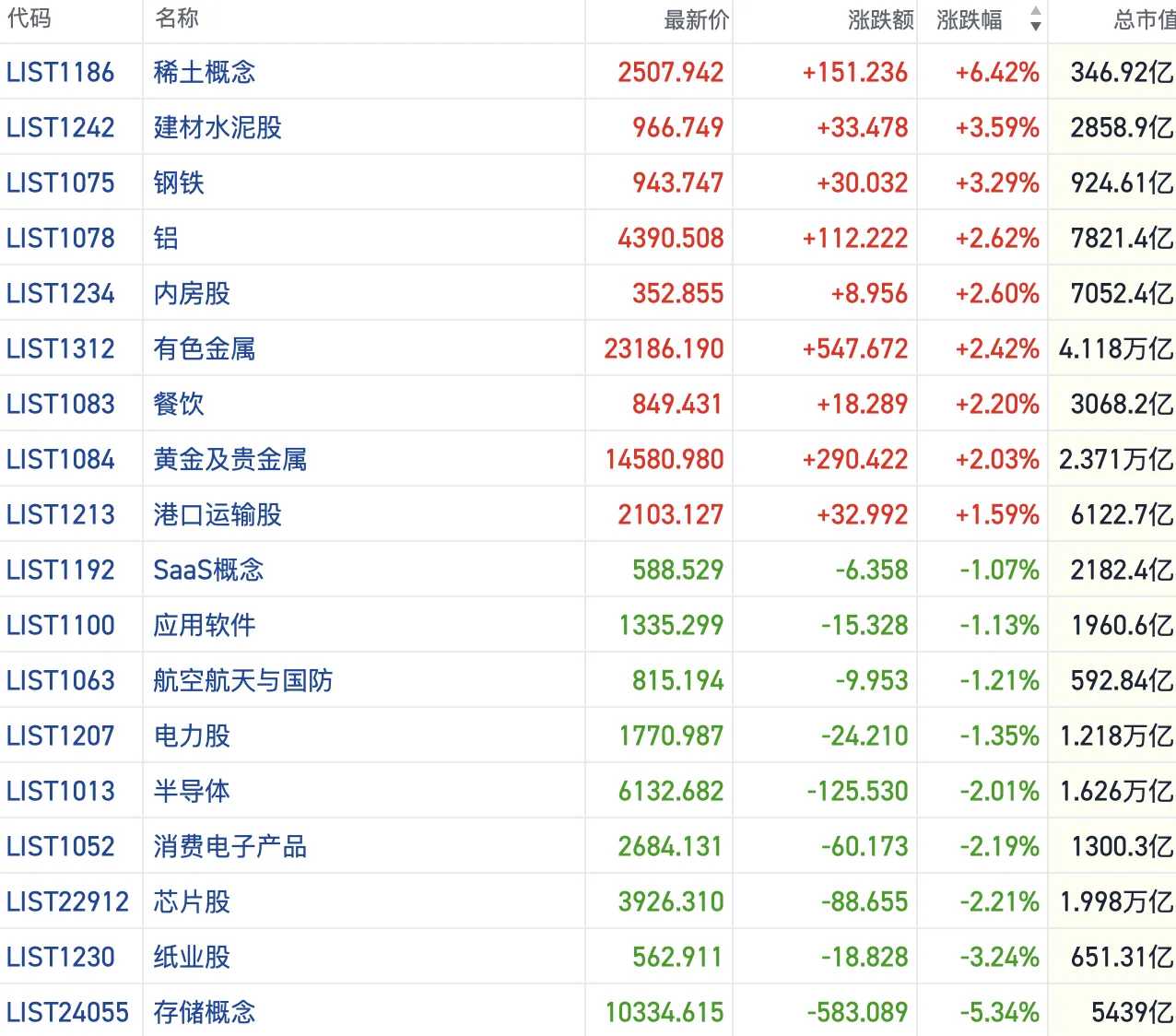 其他方向上,内房股受政策利好催化走强,钢铁、水泥建材等板块跟涨。此外,黄金、有色、锂业等资源股集体上扬,餐饮股短线活跃。