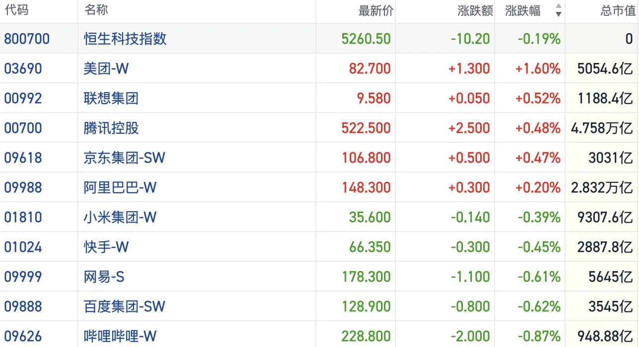 盘面上,今日大型科网股走势分化,整体窄幅震荡。美团涨1.6%,阿里巴巴、腾讯、阿里飘红,小米、快手、百度则有所走弱。