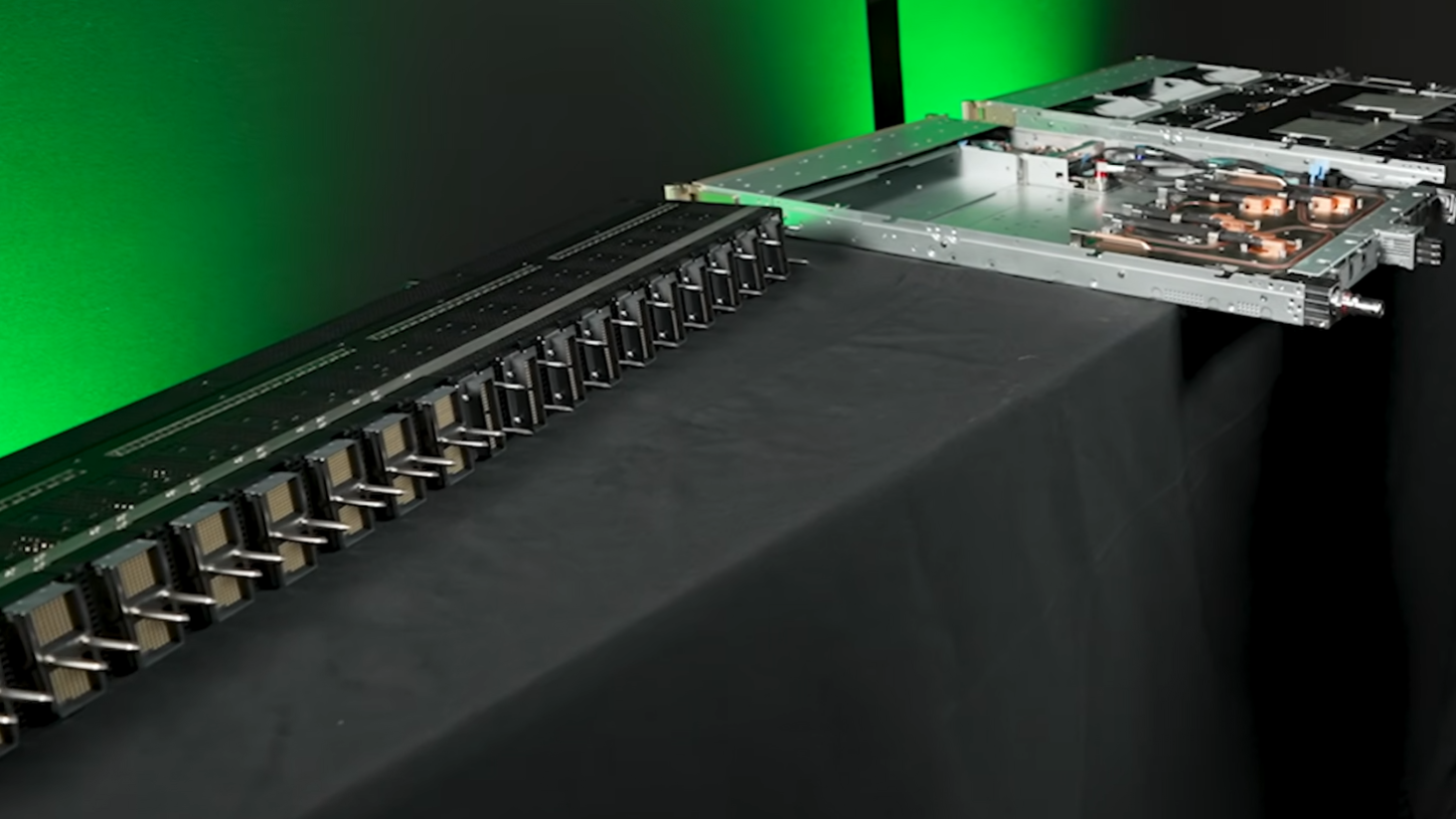 Harris也展示了数据传输速度翻倍至每秒260TB的NVLink芯片和机架主干。在单个机架中,就需要5000根铜缆将整套设备连接在一起,总长度约为两英里。