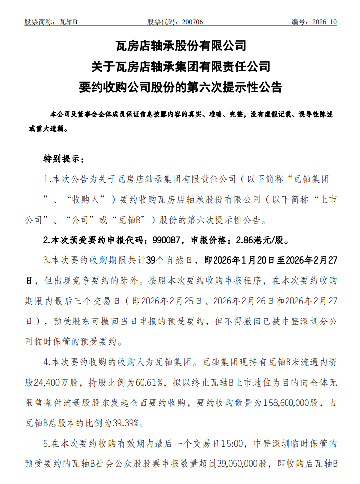 瓦轴B公司已连发六次提示性公告,强调收购期限。