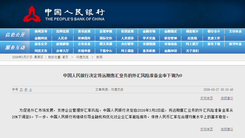 财联社2月27日讯,为促进外汇市场发展,支持企业管理好汇率风险,中国人民银行决定自2026年3月2日起,将远期售汇业务的外汇风险准备金率从20%下调至0。