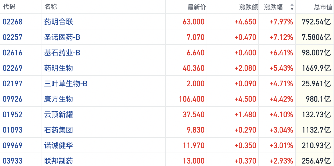 截至发稿,药明合联(02268.HK)涨近8%,药明生物(02269.HK)涨超5%,云顶新耀(01952.HK)等一批个股也纷纷跟涨3%以上。