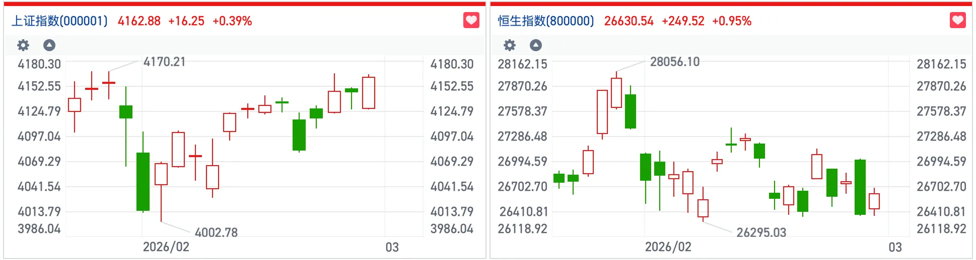 财联社2月27日讯(编辑 冯轶)今日港股短线止跌回暖。截至收盘,恒生指数涨0.95%报26630点,国企指数、恒生科技指数分别上涨0.51%及0.56%。