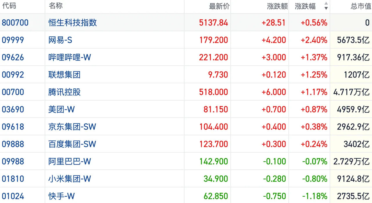 盘面上,今日大型科网股率先回暖,支撑大市反弹。腾讯盘中一度涨回到530港元。网易、美团、京东、百度飘红。