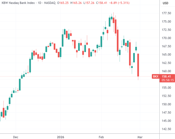 财联社2月28日讯(编辑 史正丞)美股市场周五开盘后,美国银行、资管和金融服务板块再度遭遇沉重抛售。除了人工智能引发金融系统风险的忧虑外,背靠华尔街支持的英国抵押贷款公司MFS轰然倒闭也引发私募信贷行业的信心动摇。
