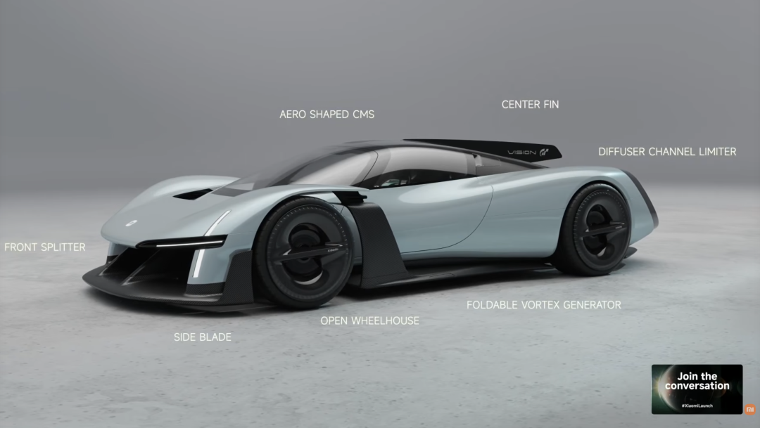 小米汽车设计总监李田原现场介绍了小米超级跑车Vison Gran Tourisimo,该车采用极致的空气动力学设计,车辆乘员舱部分被设计为一个浮动的泪滴,底部是巨大的空气动力学风道。