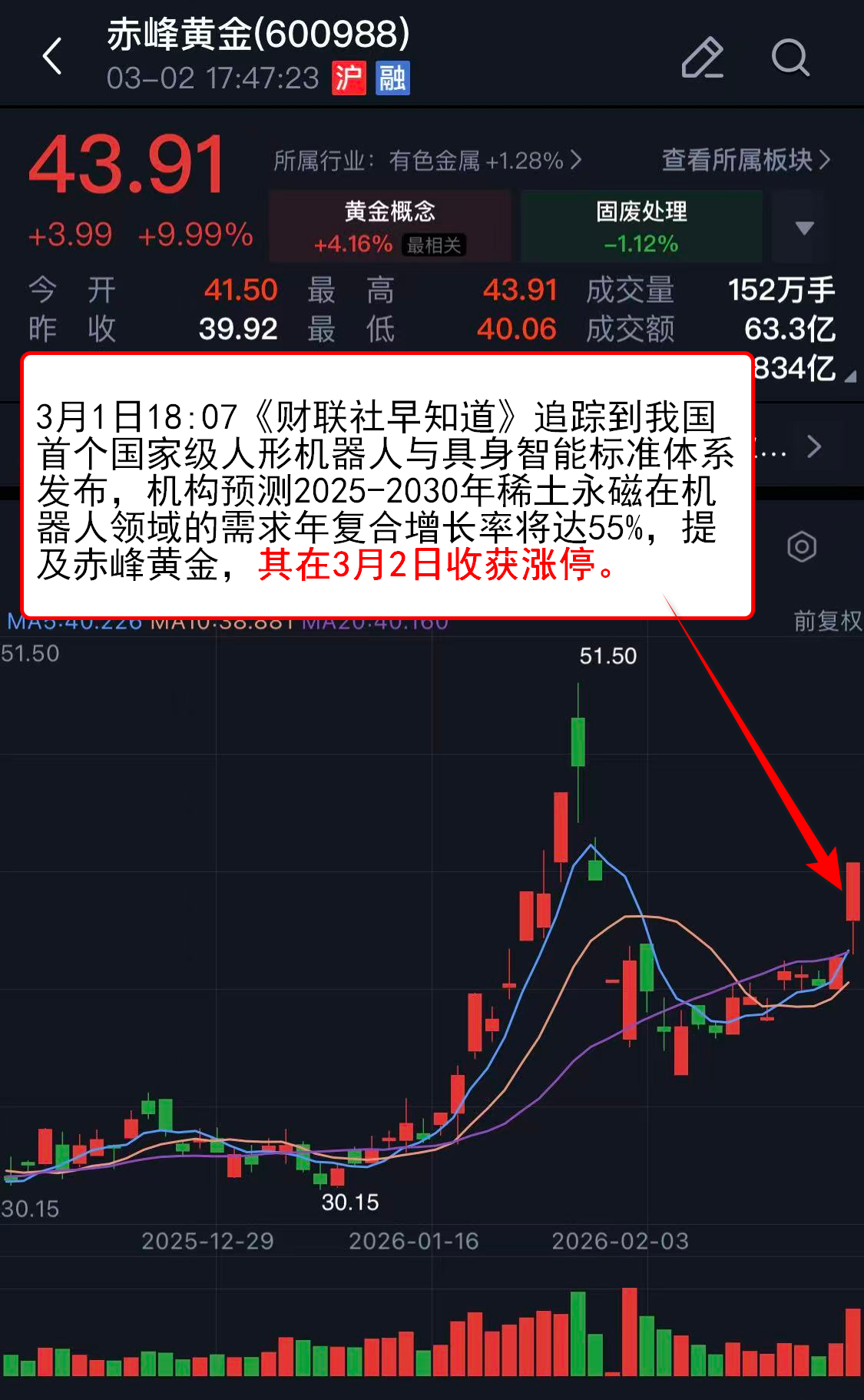 3月1日18:07《财联社早知道》追踪到我国首个国家级人形机器人与具身智能标准体系发布,机构预测2025-2030年稀土永磁在机器人领域的需求年复合增长率将达55%,提及赤峰黄金,其在3月2日收获涨停。