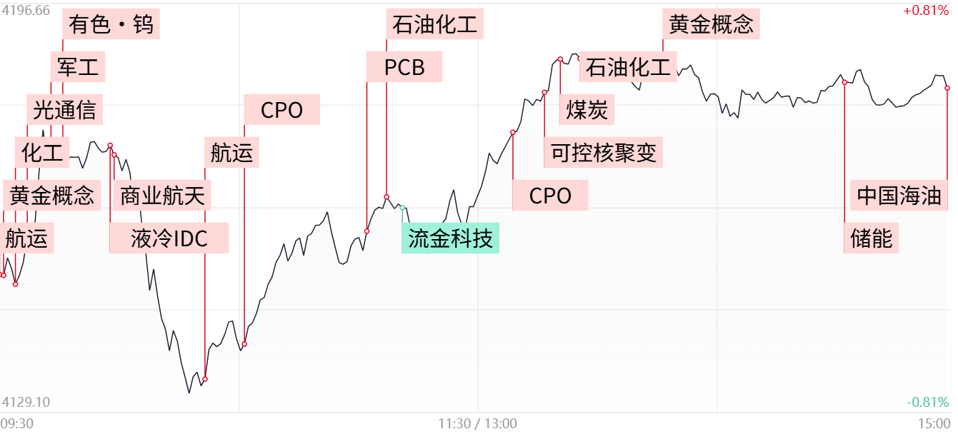 个股层面来看,今日市场呈现割裂态势,一方面逾百股涨停或涨超10%,另一方面超4200只个股收跌。其中资源类周期股集中爆发,油气股几乎全线涨停,其中“三桶油”作为核心权重首次收盘集体涨停。贵金属方向,市值超千亿的山东黄金、中金黄金双双涨停,而湖南黄金2连板。化工股反复活跃金牛化工走出11天5板。港口航运概念同样表现亮眼,招商轮船7天4板,中远海能、招商南油等涨停。此外,部分算力硬件权重同样获得资金回流,中际旭创、新易盛双双放量涨超5%。
