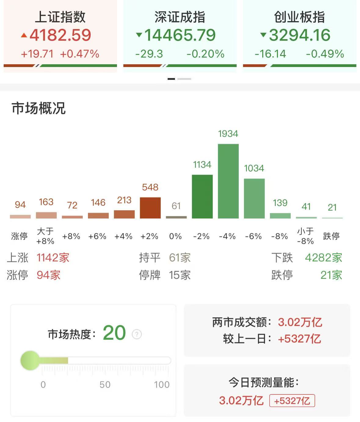 财联社3月2日讯,三大指数涨跌不一,沪指低开高走涨0.47%,创业板指冲高回落,盘中一度翻红。黄白线明显分化。沪深两市成交额3.02万亿,较上一个交易日放量5327亿。盘面上,全市场超4200只个股下跌。从板块来看,油气股全线爆发,近二十只成分股涨停,洲际油气5天3板,中国石油、准油股份、石化油服、山东墨龙、潜能恒信涨停。贵金属概念集体走强,晓程科技20cm涨停,西部黄金、四川黄金等多股涨停。化工板块反复活跃,金牛化工走出11天5板,金瑞矿业、红星发展、兴化股份涨停。港口航运概念表现活跃,中远海能、南京港、招商南油涨停。煤炭板块午后拉升,中煤能源触及涨停创17年新高。下跌方面,光伏设备概念集体下挫,双良节能一字跌停。截至收盘,沪指涨0.47%,深成指跌0.2%,创业板指跌0.49%。