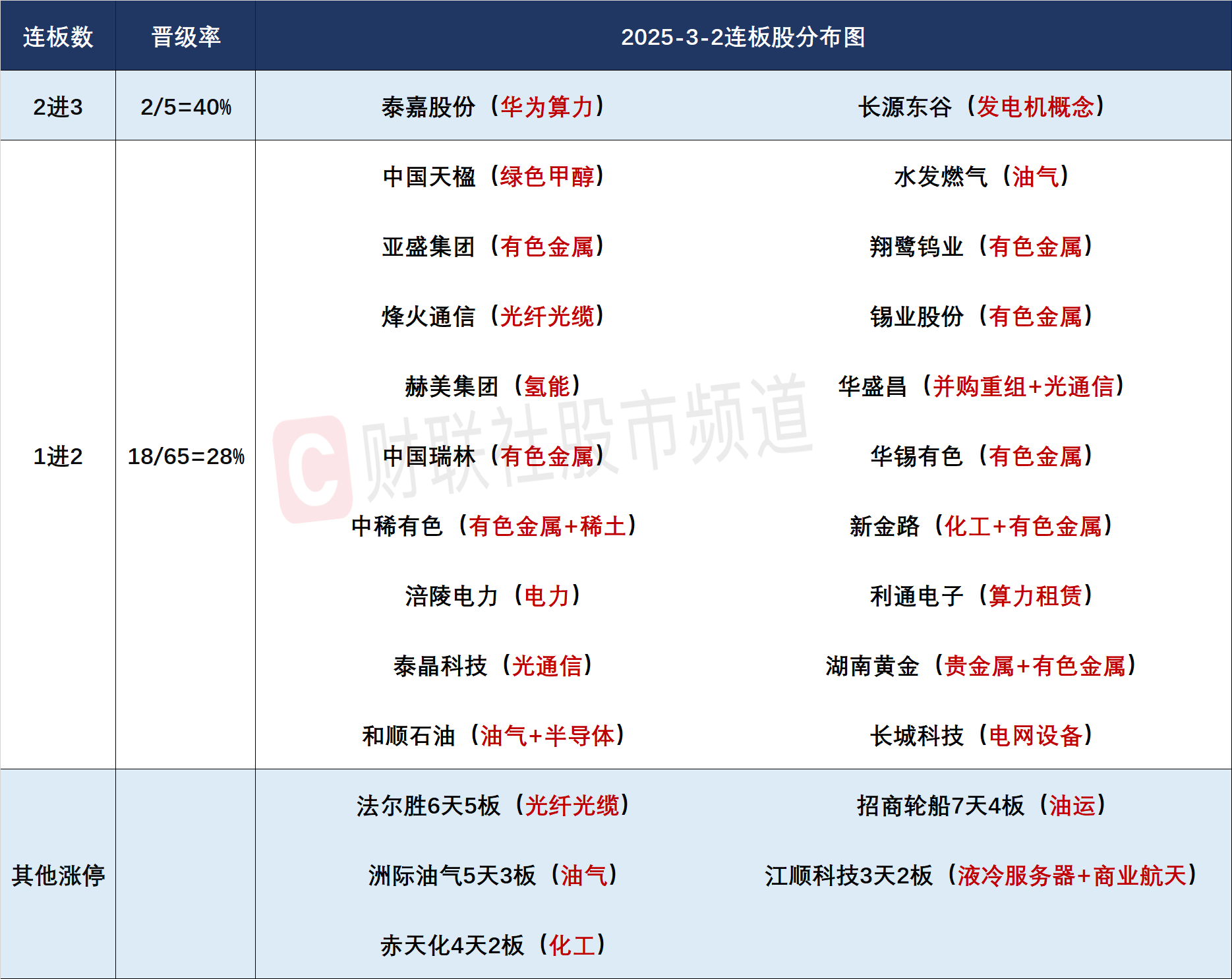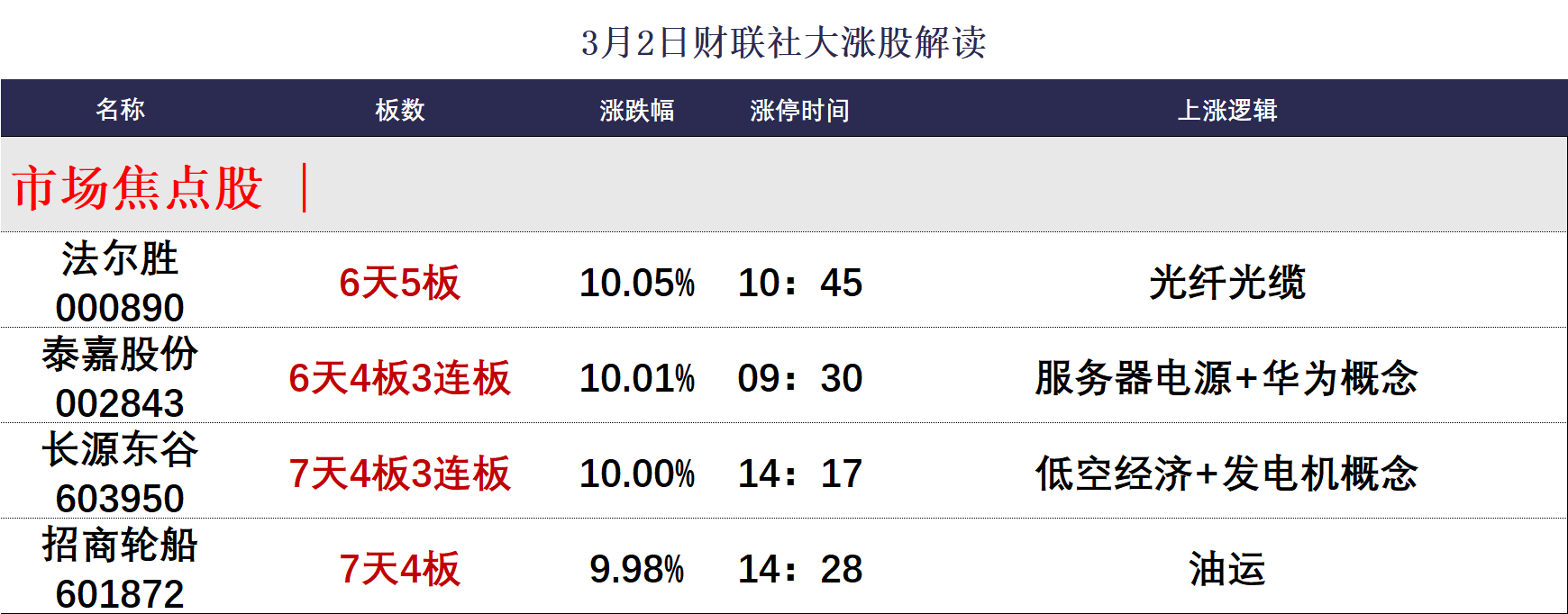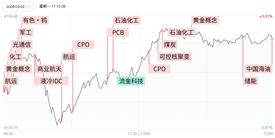 财联社3月2日讯,今日88股涨停,28股炸板,封板率为76%,泰嘉股份、长源东谷3连板,法尔胜6天5板,招商轮船7天4板,新锦动力、潜能恒信、通源石油20cm5天2板,北交所科力股份30cm涨停。三大指数涨跌不一,沪指低开高走涨0.47%,创业板指冲高回落,盘中一度翻红。黄白线明显分化。沪深两市成交额3.02万亿,较上一个交易日放量5327亿。盘面上,全市场超4200只个股下跌。板块方面,油气、有色、化工、航运板块领涨;AI应用、传媒、光伏、航空机场板块领跌。