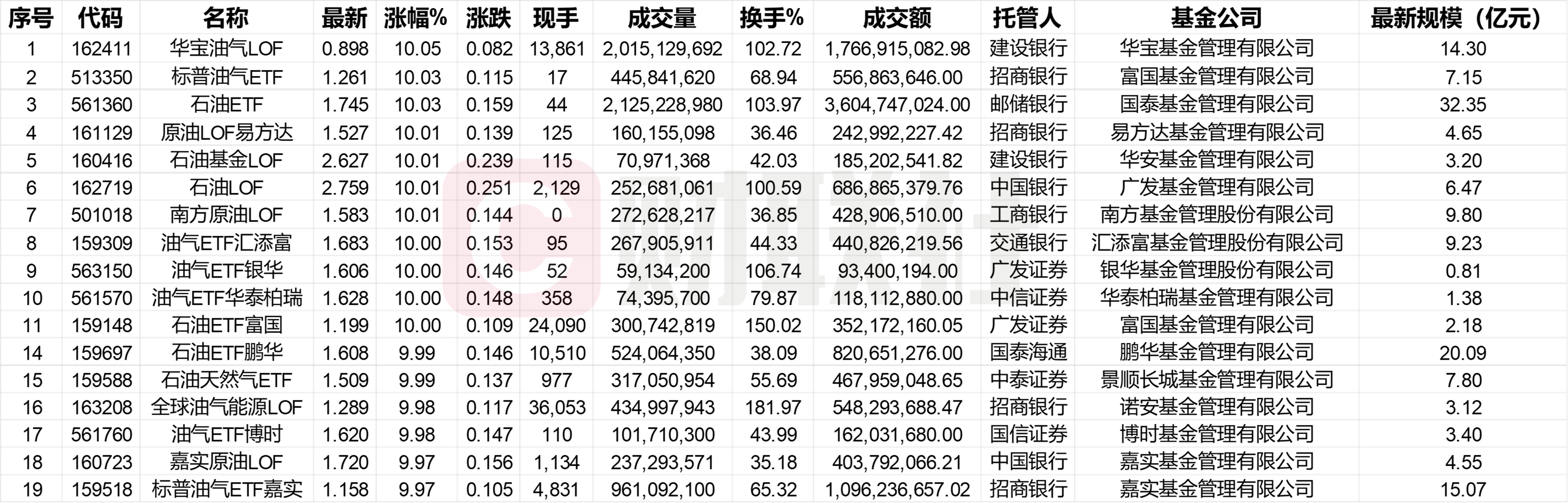 19只上市油气基金全线爆发,均达到10%的涨停限制