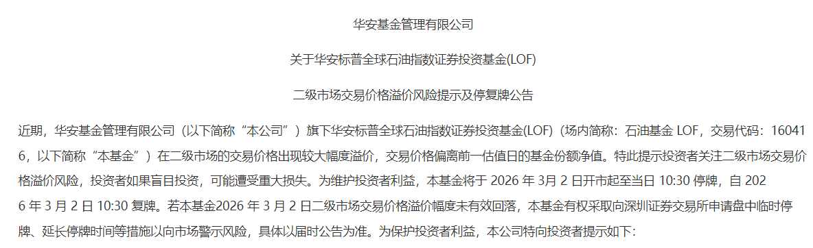 财联社注意到,多只原油 LOF在近日密集发布溢价风险提示公告,二级市场交易价格出现较大幅度溢价。为维护投资者利益,石油基金LOF于今日开市起至当日10:30实施停牌,但在10:30复牌后,资金涌入依旧猛烈,约半小时后封死涨停。