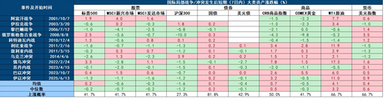 根据国信证券策略团队的梳理,2000年以来共有12 次较为典型的国际局部战争/冲突,在事件发生的发生一周内,标普500涨幅中位数为-0.2%、上涨概率为 42%,沪深300涨幅中位数为-1.2%、上涨概率仅为27%。而美元指数上涨概率为67%,WTI原油涨幅中位数为3.2%、上涨概率为67%。