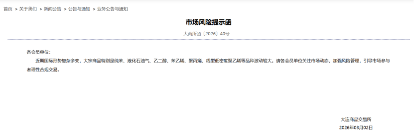 对于化工品种的表现,大商所盘后提示风险称,近期国际形势复杂多变,大宗商品特别是纯苯、液化石油气、乙二醇、苯乙烯、聚丙烯、线型低密度聚乙烯等品种波动较大。请各会员单位关注市场动态,加强风险管理,引导市场参与者理性合规交易。