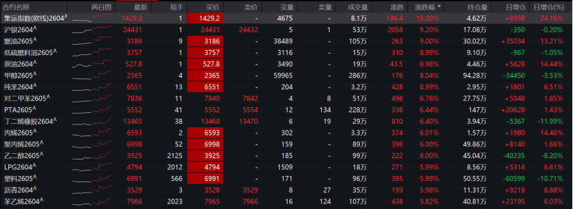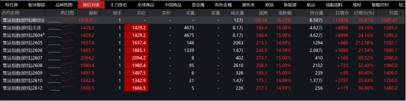 随着15%的涨幅下,截至今天收盘,集运指数(欧线)期货主力2604合约收报1429.2,其余月份合约同步涨停。