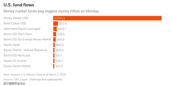 LSEG理柏数据显示,全球货币市场基金在周一的流入资金479亿美元,创2月17日以来新高,投资者纷纷寻求短期现金类工具避险。