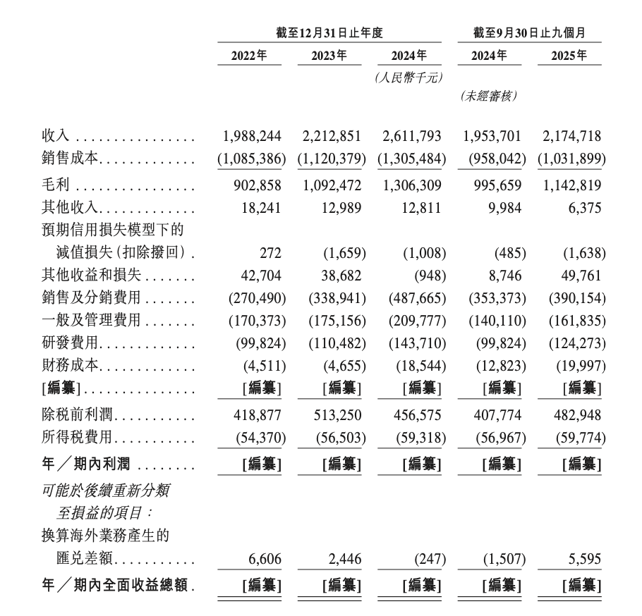 同期,其毛利分别为9.0亿元、10.9亿元及13.0亿元,复合年增长率为20.3%,对应的毛利率分别为45.4%、49.3%及50.0%;2025年前三季度毛利达11.4亿元,同比增长14.8%,毛利率提升至52.5%。