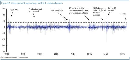 而如果我们观察目前油价的单日涨幅——虽然这已是自2022年以来最大的单日涨幅,但很难说这是“一代人仅见”的波动,因为自1990年以来已经发生过55次类似这种规模的波动。