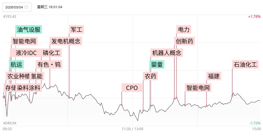 连板晋级率降至18.9%,亚盛集团、水发燃气实现3进4。近期火热的油气、航运等中东局势相关方向呈现两极分化,洲际油气、准油股份等多股晋级3连板的同时,长江能科、德石股份、特瑞斯等多只20、30厘米个股跌超10%。油气等方向分歧之际,具备抗通胀属性的农业、化工以及中东局势相关的无人机为首的军工等低位方向相继展开轮动修复,反映当前短线资金的避险意愿依旧高企。此外随着短线接力情绪降温,部分趋势抱团方向重新获得资金回流,电网设备、绿电绿氢产业链展开强修复,杭电股份、神马电力等多股实现反包涨停,算力硬件端也出现局部修复。整体而言,在油气等当前主线分歧之际,超跌以及趋势抱团方向仍呈现快速轮动,反映当前市场整体风偏改善仍较为有限。