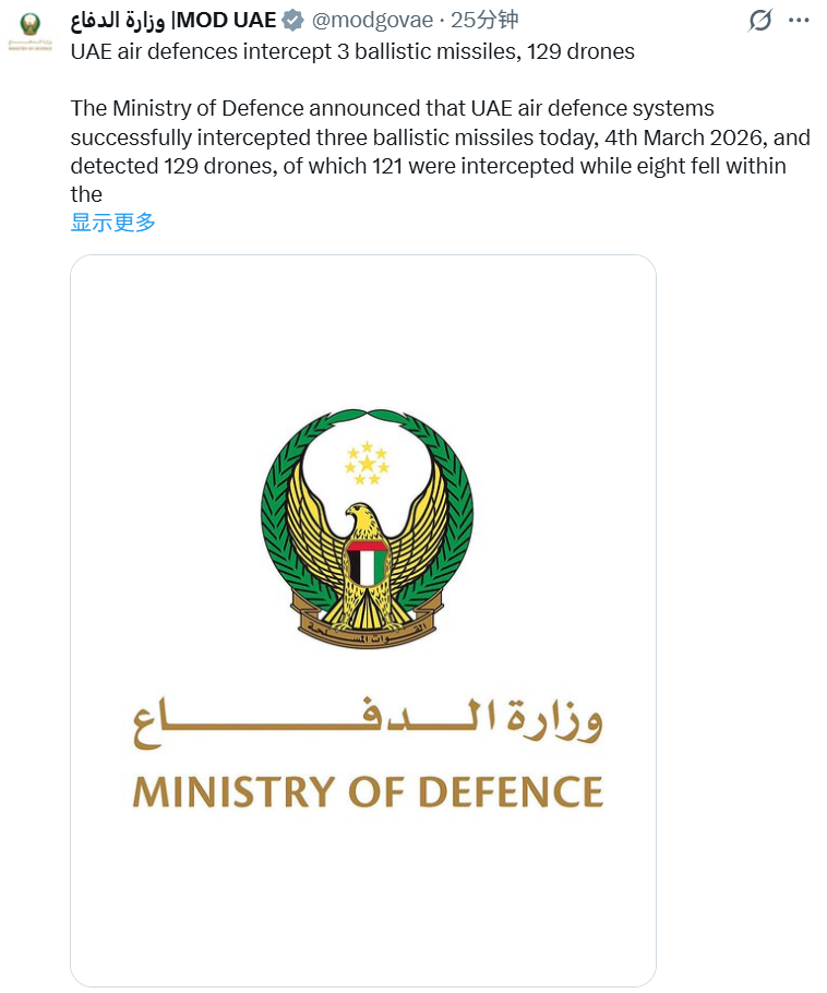 阿联酋国防部通报,在本轮袭击中,已经导致3名外国公民死亡,另有78人受轻伤。