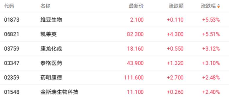 财联社3月5日讯(编辑 胡家荣)今日港股医药板块表现活跃。截至发稿,维亚生物(01873.HK)5.53%、凯莱英(06821.HK)涨5.51%、康龙化成(03759.HK)涨3.10%、泰格医药(03347.HK)涨3.10%。