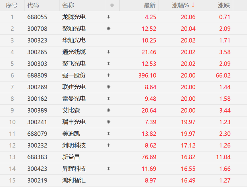 《科创板日报》3月5日讯 3月5日,MicroLED概念开盘活跃。截至午间,A股涨幅榜前列大多数席位被“光电”包揽,龙腾光电、聚灿光电、华灿光电、通光线缆、聚飞光电、雷曼光电、艾比森等MicroLED概念股20CM涨停。